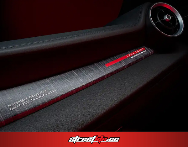 Im Innenraum setzt sich die enge Verbindung zur Luna Rossa konsequent fort. Die Bezüge der Sparco-Sportsitze orientieren sich optisch an den Rettungswesten der Rennyacht. In die Verkleidung der Armaturentafel ist zudem eine hauchdünne Folie integriert, die aus einer Schicht des originalen Segels der Luna Rossa gefertigt wurde. Ergänzt wird das Interieur durch weitere Sichtcarbon-Applikationen sowie einen „Luna Rossa“-Schriftzug auf der Mittelkonsole.